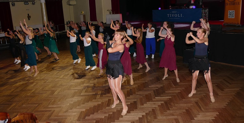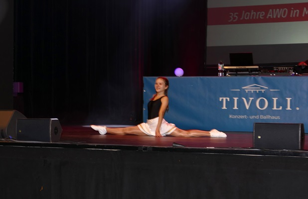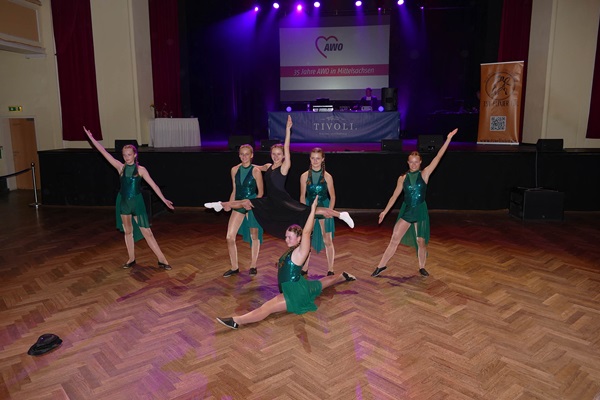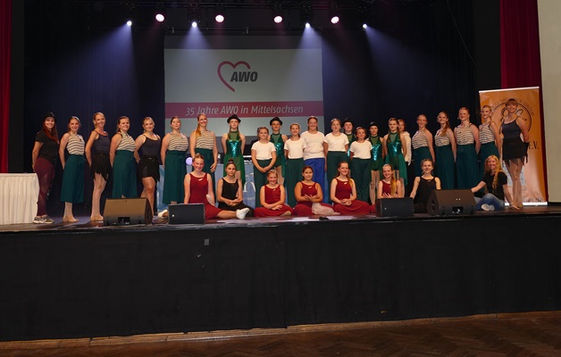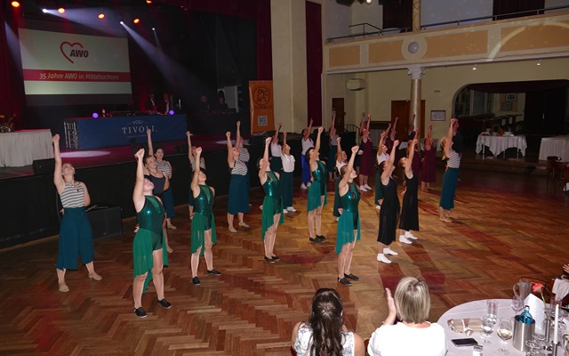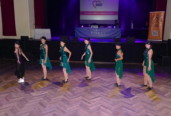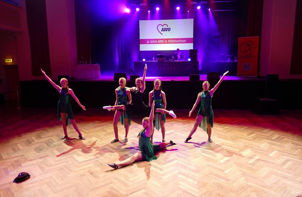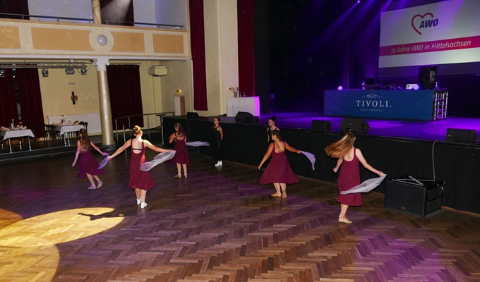 Die AWO Freiberg feierte im Ballhaus Tivoli ihr Jubiläum und lud Freunde und Bekannte zu einem feierlichen Abend mit allen Gästen zu ein. Die AWO verfügt über mehrere Arbeitsbereiche und stellte an diesem Abend die verschiedenen Außenstellen und Neuerungen vor. Nach dem Abendessen durften wir als Verein ein buntes Tanzprogramm mit verschiedenen Gruppen zusammenstellen. Wir wollten dabei die Vielfalt unserer Tanzgruppen in Tanzart und Musik zeigen. Eine Schwierigkeit war dabei, alle Tänzerinnen so einzuplanen, dass ein störungsfreier Ablauf gewährleistet wurde. Am Ende wurde sowohl vor als auf der Bühne bei tollem Licht und festlichem Ambiente getanzt.