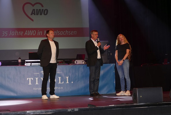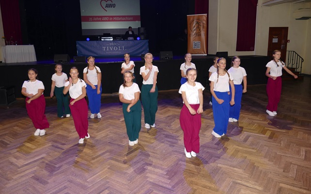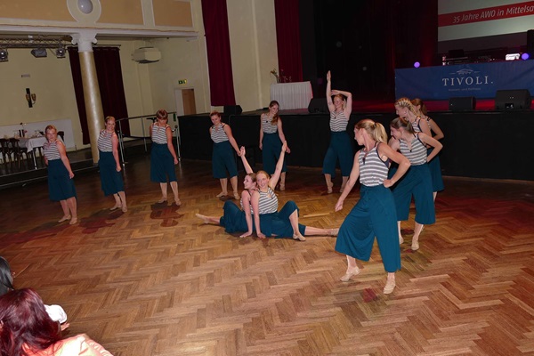 Die AWO Freiberg feierte im Ballhaus Tivoli ihr Jubiläum und lud Freunde und Bekannte zu einem feierlichen Abend mit allen Gästen zu ein. Die AWO verfügt über mehrere Arbeitsbereiche und stellte an diesem Abend die verschiedenen Außenstellen und Neuerungen vor. Nach dem Abendessen durften wir als Verein ein buntes Tanzprogramm mit verschiedenen Gruppen zusammenstellen. Wir wollten dabei die Vielfalt unserer Tanzgruppen in Tanzart und Musik zeigen. Eine Schwierigkeit war dabei, alle Tänzerinnen so einzuplanen, dass ein störungsfreier Ablauf gewährleistet wurde. Am Ende wurde sowohl vor als auf der Bühne bei tollem Licht und festlichem Ambiente getanzt.